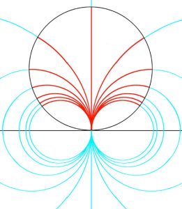 Here a boundary circle shown in black defines and encloses the area of investigation. On the model, the properties of the space being examined is ascertained with reference to the lines shown in red, while the turquoise lines are the lines of construction from which the red lines derive, with the initial two circles of the two halves not necessarily having to be the same size. Inherent in astrolabes and quadrants, the above construction shows that there is something non-Euclidean going on.