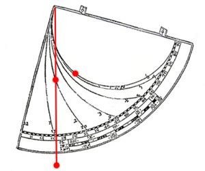 This is the Co-Latitude and is the mean height of the sun at midday or in other words, the height of the sun at Equinox. The plumb-line is then pulled tight over the point on the Zodiac scale appropriate to the day in question (which is also the declination of the sun on that day) and a moveable bead is set at the point where the plumb-line crosses the semi-circle that marks the sixth hour. The altitude of the sun is then measured, with the position of the moveable bead on the plumb-line indicating local time as told in what horologists call „unequal hours“.